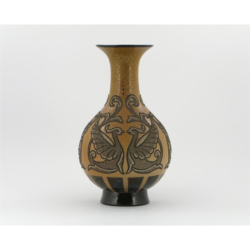 A Doulton Lambeth stoneware vase by Elisa Simmance, dated 1885, decorated with applied beadwork exotic birds, on a crackled ground impressed and incised marks, professionally restored neck 30.5cm. high