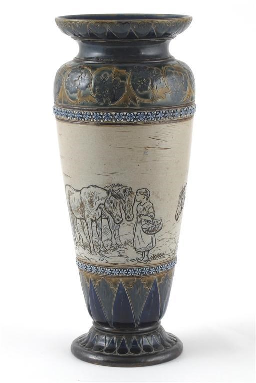 A Doulton Lambeth stoneware vase by Hannah Barlow, dated 1881, incised with a band of horses resting by a young girl, between borders of flowers and foliage, glazed green, blue and ochre on a buff ground impressed marks, incised monogram restored neck 30cm. high