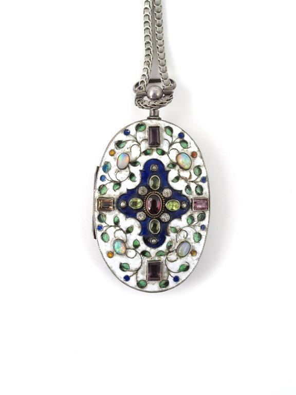 A silver and cloisonne enamel, jewel encrusted pendant locket by George Hunt, oval, the reverse etched with the Judgment of Paris, the front enamelled with foliate sprays in green, blue and white, inset with opal and amethyst stones stamped GH shield mark to interior 7.5cm. high