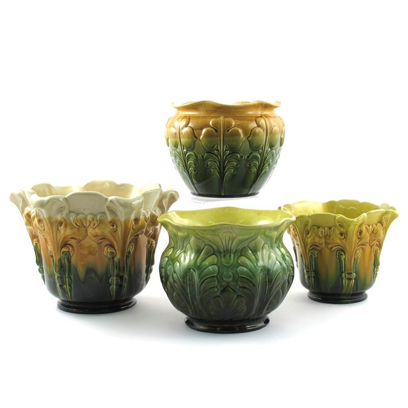A Bretby Pottery jardinere, cast in relief with stylised foliage columns, glazed yellow to green, and three other jardinieres impressed marks, minor damages 24cm. high