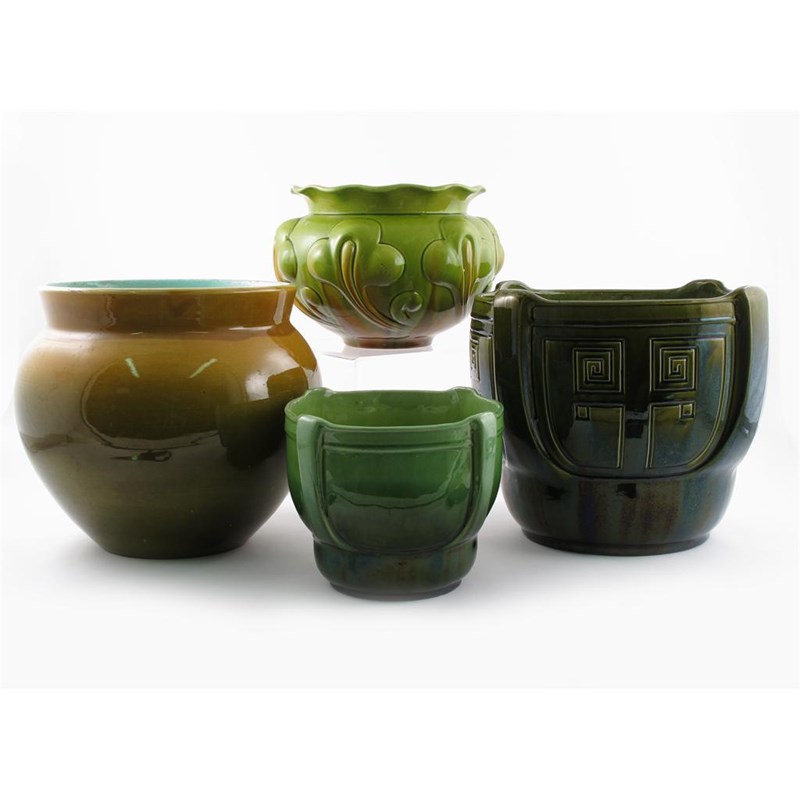 A Bretby Pottery ovoid jardiniere, with everted rim, modelled in relief with stylised foliage, glazed yellow and green, two Bretby Secessionist jardiniere and another jardiniere various impressed marks, damages largest 29cm. high