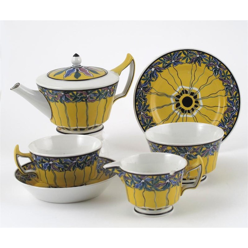 A Wedgwood part tea for two, painted with stylised flowers in shades of blue, purple and green on a yellow ground, comprising; teapot and cover, milk-jug and sugar basin, one cup, two saucers and a side plate impressed marks teapot 11cm. high