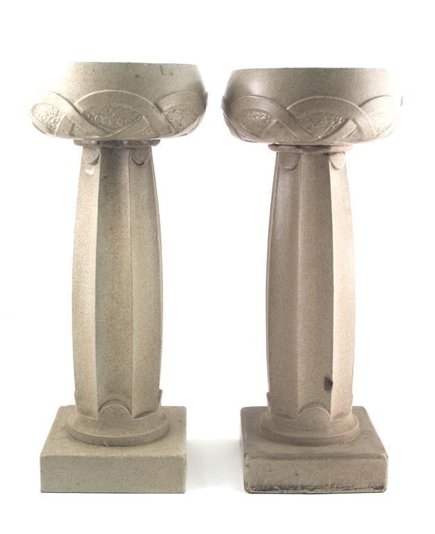 A pair of Leeds Fireclay jardinieres, pedestal form with flaring bowl cast with a scrolling band, glazed oatmeal, unsigned, chips 81cm. high