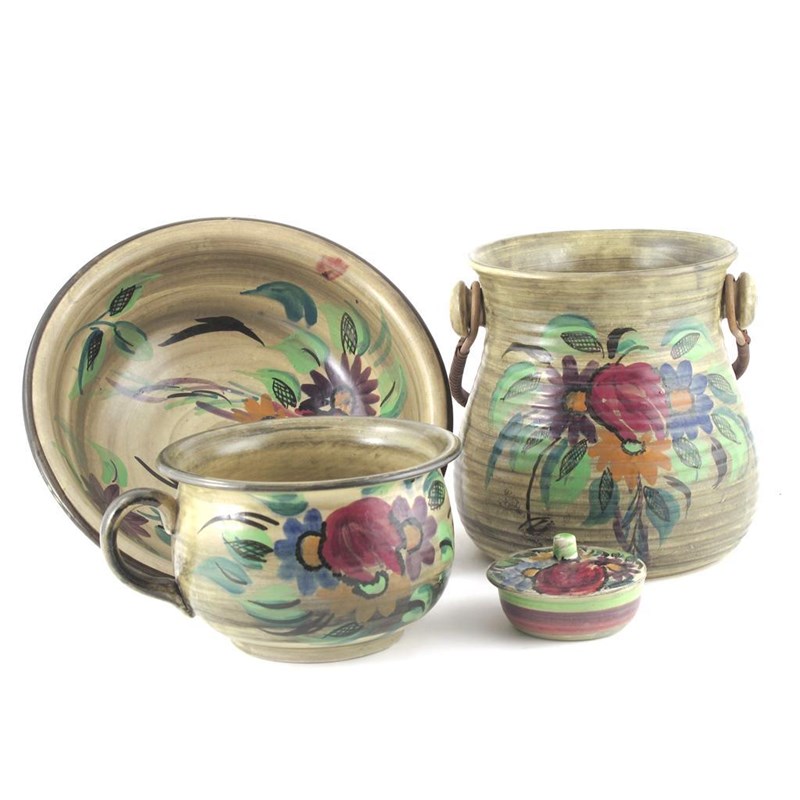 'Gardiniere' a pottery wash set designed by Mabel Leigh painted with flower in colours, comprising; pail, large bowl, box and cover and a chamber pot printed and painted marks 23cm. high