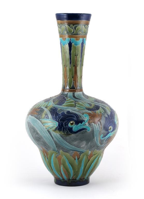 A large Burmantoft's Faience Anglo Persian vase model no.2123, decorated with classical dolphin in shades of blue, green and turquoise, between borders of stylised foliage impressed marks, repaired neck 54 cm. high