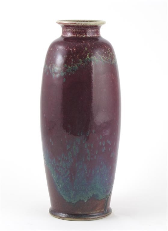 A Ruskin Pottery high-fired stoneware vase dated 1910, shouldered cylindrical form, glaze lavender and sang de beouf with turquoise splashes impressed marks, minor professional restoration to base rim 30cm. high