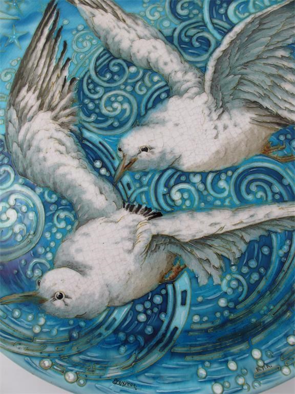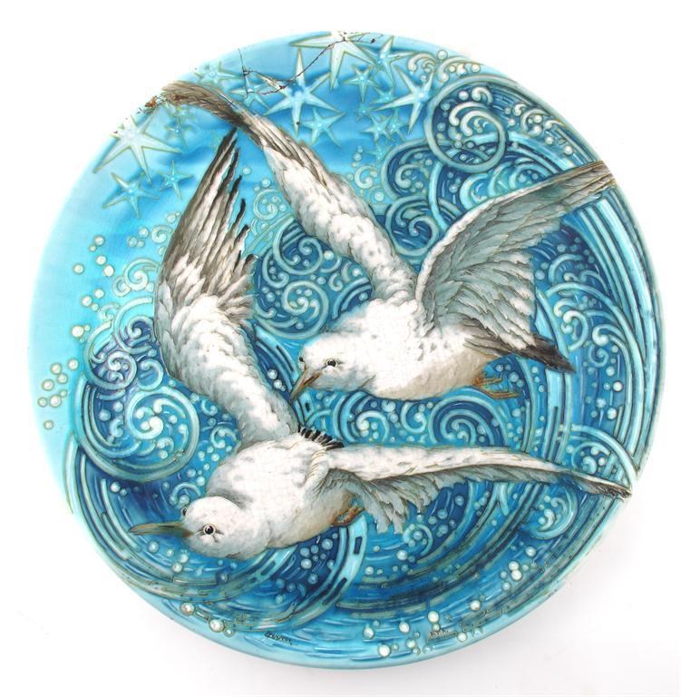 A large and impressive Keramis charger by Etondeur painted with two petrols before a geometric waves and stars, in colours on a vivid blue ground, highlighted in gilt painted signature, painted marks to reverse, restuck section to rim 62cm. diam.