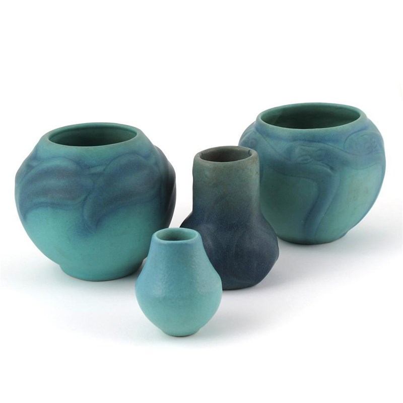 A Van Briggle ovoid vase, modelled in low relief with a frieze of foliage, glazed matt blue, another similar and two smaller Van Briggle vases incised marks 11cm. high