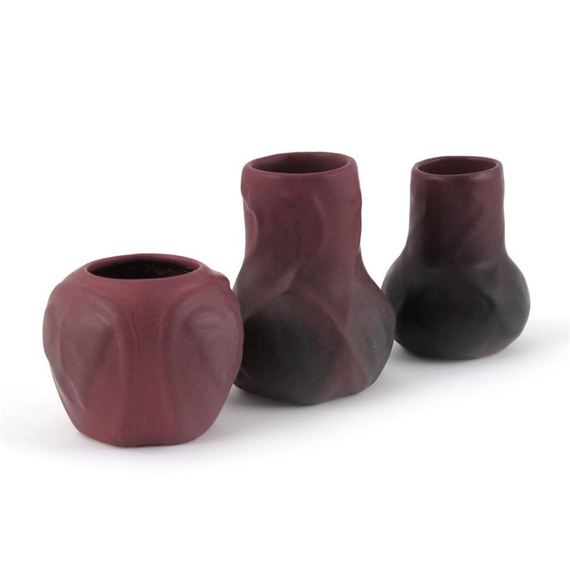A Van Briggle pottery vase modelled in low relief, glazed matt pink, another smaller and a Van Briggle shouldered vase similar incised marks 11.5cm. high