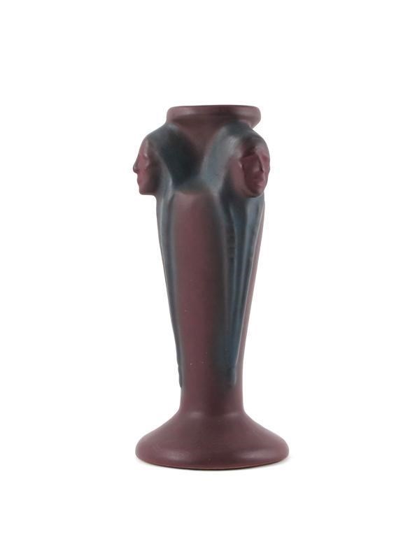 A Van Briggle pottery vase modelled in relief with three native indian heads, glazed deep red and blue etched marks to base 31cm. high