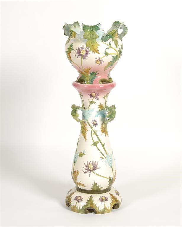 A Delphin Massier Art Nouveau jardiniere and stand, the bowl modelled in low relief with thistle flowers, and three applied looped foliate handles, the stem with similar modelled leaves and flower stems, in colours on a white ground painted Delphin Massier marks, 113cm. high