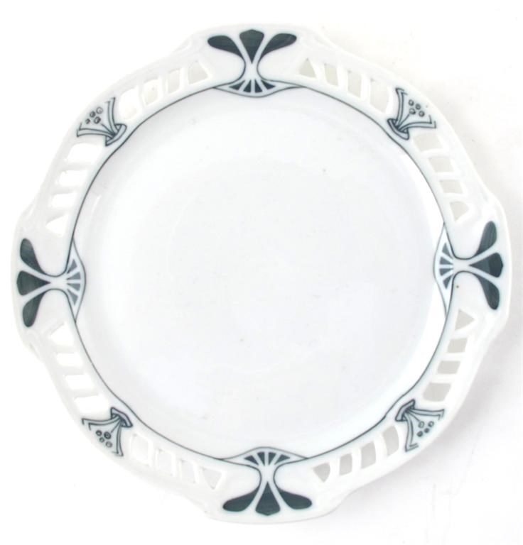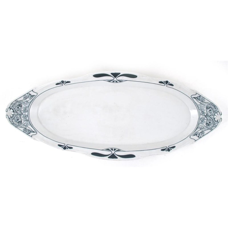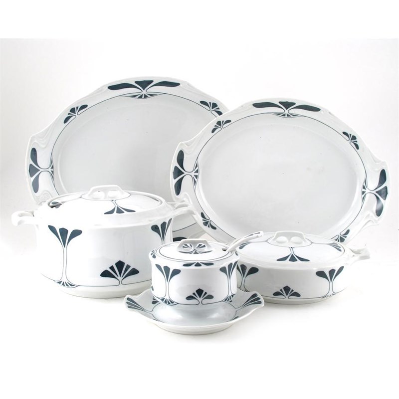 A large Porzellan-Manufaktur Burgau service designed by Ferdinand Selle, modelled in low relief and printed in blue with a stylised flower design, comprising; a large soup tureen and cover, four graduated platters,, two tureen and covers, a sauce tureen, cover and ladle, an open sauce boat, a small tray, nine dinner, six entree and eight side plates, two other small plates, eight soup bowls and a large fish platter decorated with leaping fish printed marks, minor damages largest platter 50cm. wide