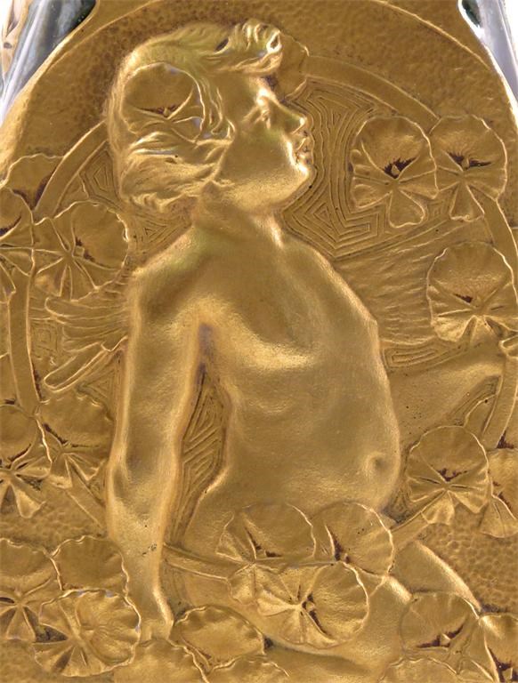 A Charles Korschann Art Nouveau gilt bronze mounted vase the tapering rectangular body cast with Art Nouveau child amongst strapwork and flower panels, the reverse with Louchet Paris seal signed PL Alp 19cm. high