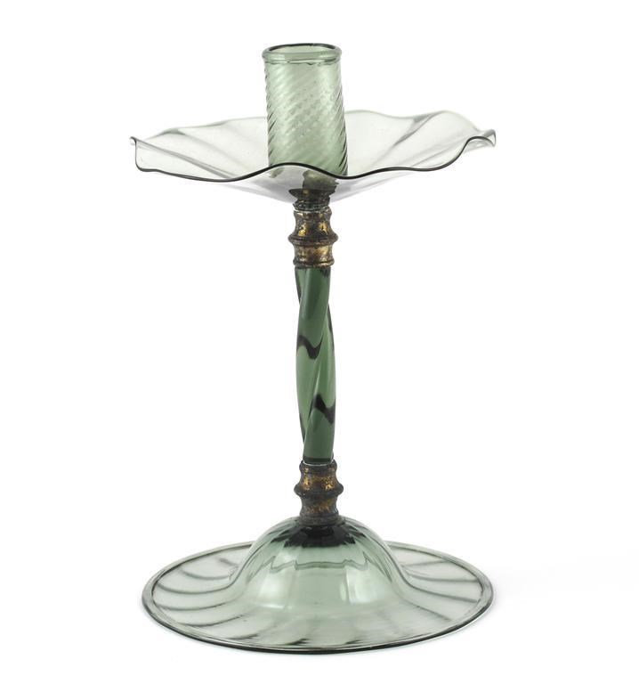 A James Powell & Son, Whitefriars green glass candlestick, flaring domed foot with central twist stem and fluted wide drip pan, twisted sconce unsigned 23cm. high