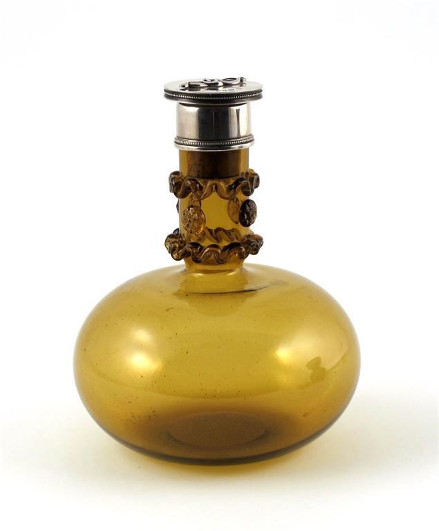 A James Powell & Son, Whitefriars amber glass decanter with silver neck and stopper, the ovoid body with cylindrical neck, applied with rigoree bands and prunts neck and stopper stamped F N & S Ltd London 1922/23 18cm. high