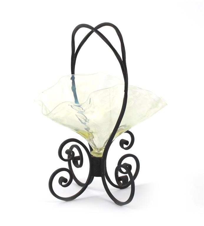 A James Powell & Sons Whitefriars straw opal glass basket on wrought iron mount probably designed by Harry Powell, unsigned 20cm. high