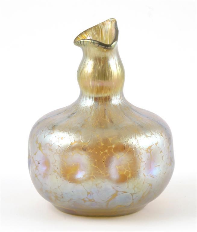 A Loetz solifleur glass vase shouldered form the body with band of impressed decoration, the swollen neck with vertical pull to rim, splashed iridescent finish unsigned 19 cm. high