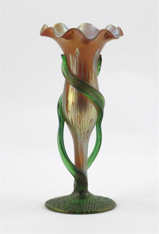 A Loetz orange Phanomen glass flower vase modelled as a single trumpet flower with two scrolling leaves, on flaring base, unsigned 27.5cm. high