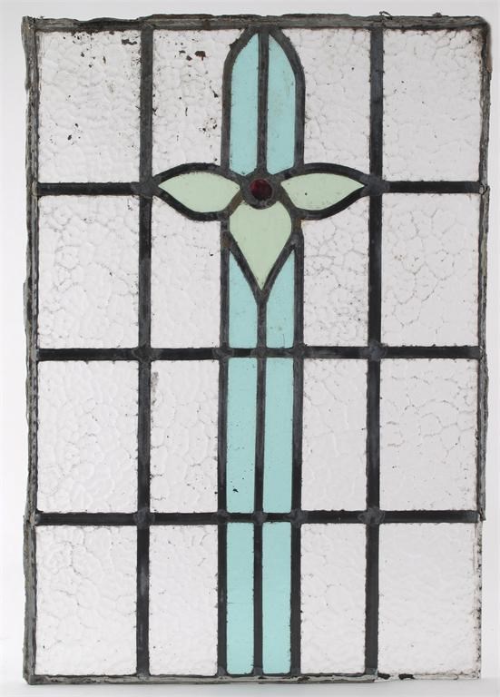 Ten various Edwardian stained glass windows each with simple stylised flower panels largest 79 x 46cm.