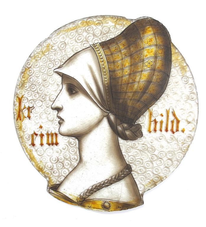 A painted glass roundel of a woman in profile portrait unsigned 22cm. high