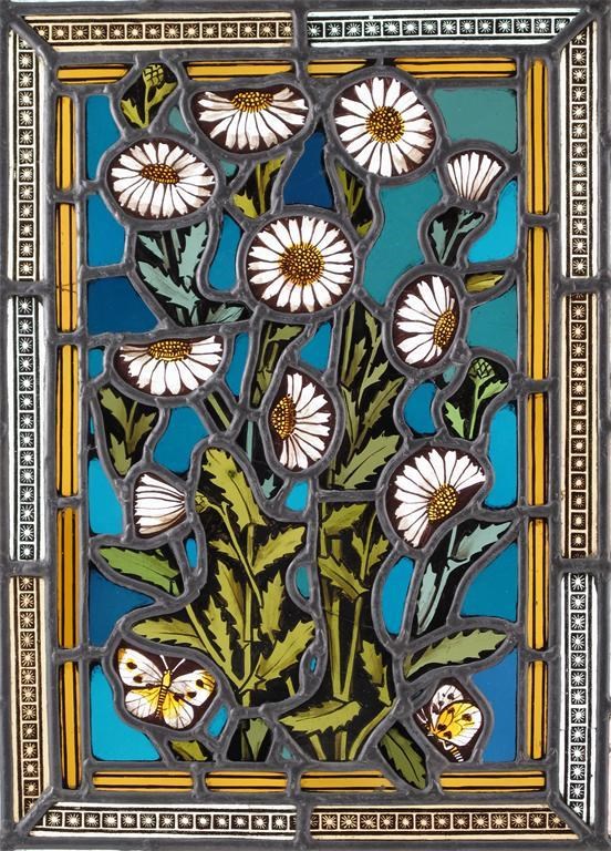 Four Aesthetic Movement stained glass panels rectangular with flower and fruit panels, and geometric foliate border unsigned 61 x 50cm.