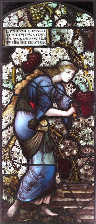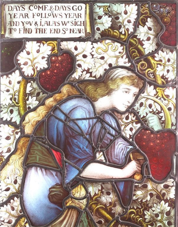 'Days Come and Days Go' a stained glass panel, designed by Charles Edward Kempe decorated with a woman harvesting grapes from fruiting vine, possibly an allegory for summer, inscribed Days come and days go, year follows year, any you and i alas we sigh, to find the end so near' unsigned 116 x 48cm.
