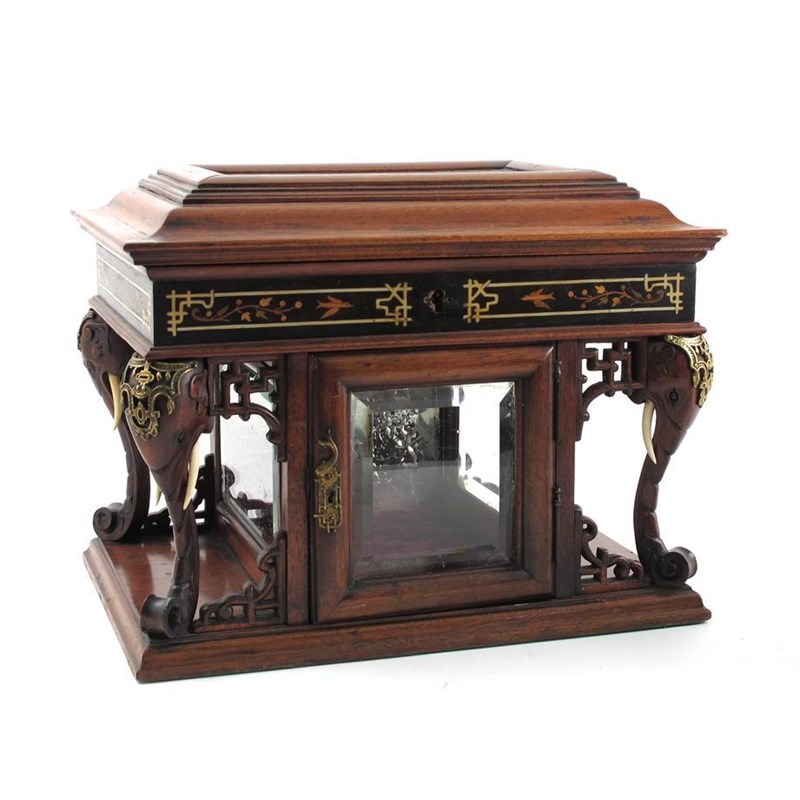 An Aesthetic Movement jewellery casket, probably Indian, rectangular section, with hinged lid and bevelled glass door, the overhanging cover supported with elephant head columns, mixed woods inlaid with ivory and applied with gilt metal unmarked 35.5cm. wide