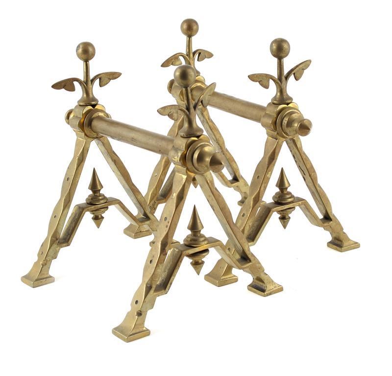 A pair of Benham & Froud brass fire dogs designed by Dr Christopher Dresser,  with angular foliate terminals, stamped mark 26 cm. wide