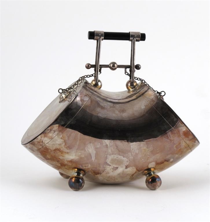 A Hukin & Heath electroplated biscuit barrel, in the manner of Dr Christopher Dresser, model no. 01318, twin door form with ebonised wood handle, on ball feet stamped number to base 25 cm. wide.