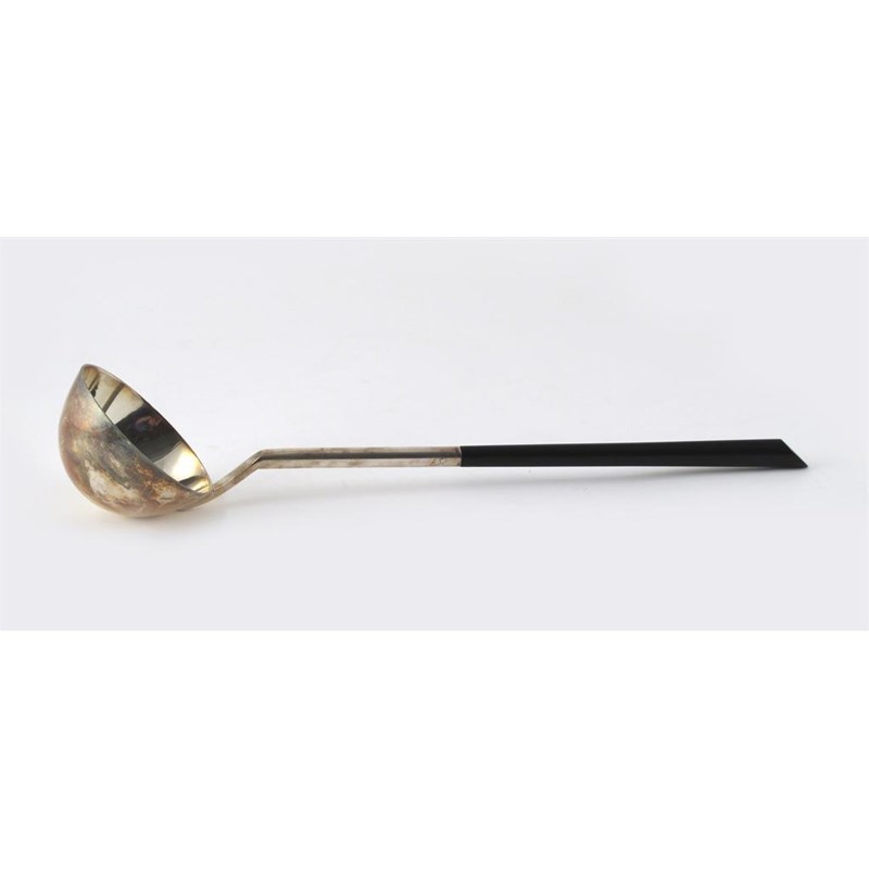 A modern ebonised wood and electroplate soup ladle originally designed by Dr Christopher Dresser unsigned 35cm. long