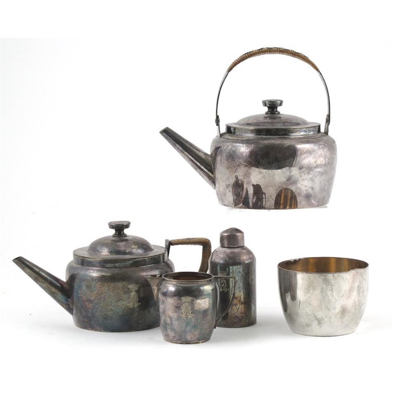 A Hukin & Heath electroplated Picnic tea set designed by Dr Christopher Dresser, comprising; teapot and cover, hot-water pot and cover, milk-jug and sugar basin, and a spirit flask stamped marks, designed by Dr C Dresser to tea pot 17 cm. wide