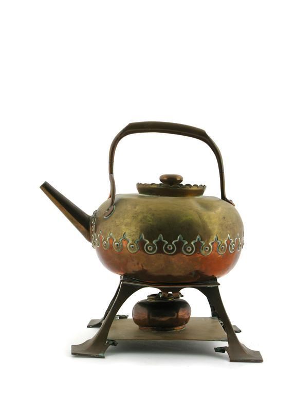 A Benham & Froud copper and brass teapot and stand designed by Dr Christopher Dresser, probably manufactured for the Art Furnishers' Alliance ovoid body with riveted brass decoration, applied tripod over-slung handle, the stand with loose brass shelf supported on scroll rests stamped 5 25cm. high