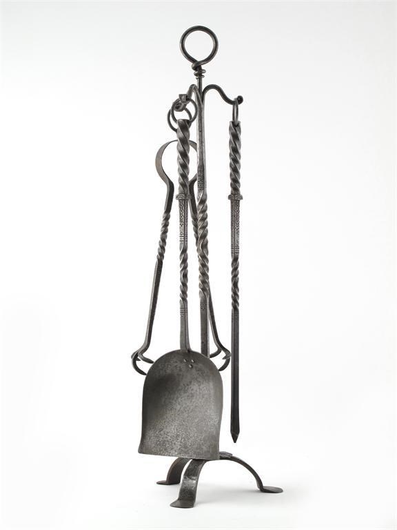 A set of Thornton & Downer  wrought iron firetools on stand comprising tongs, shovel and poker, each with twist and punched decoration unsigned 71cm. high