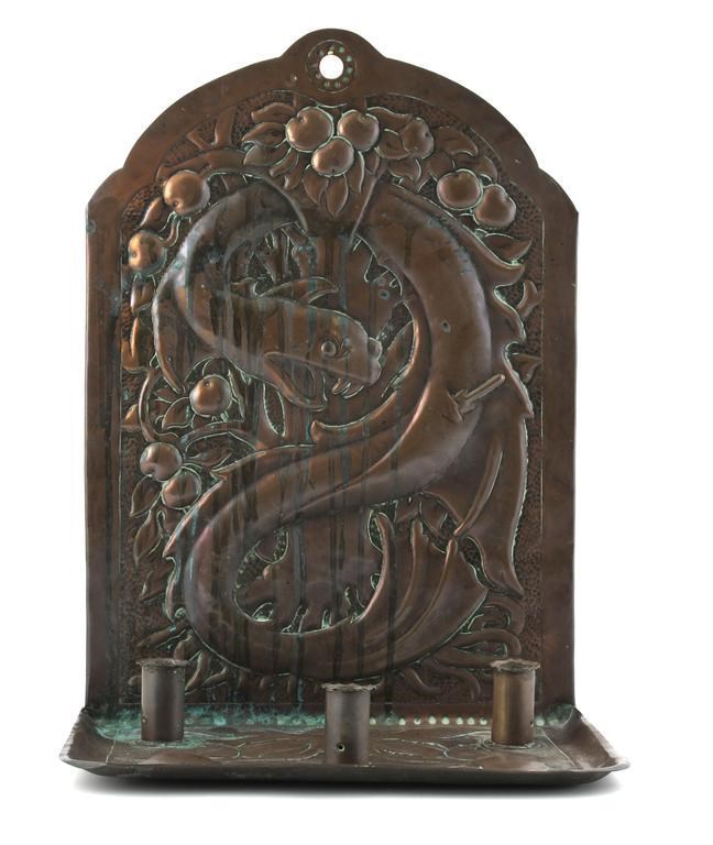 A large Newlyn copper wall sconce by John D Mackenzie and P Hodder, repousse hammered with a speared serpent in an apple tree, based on the Earth design by J D Mackenzie for the exterior panels of the Newlyn Art Gallery, etched marks 41.5cm. high
