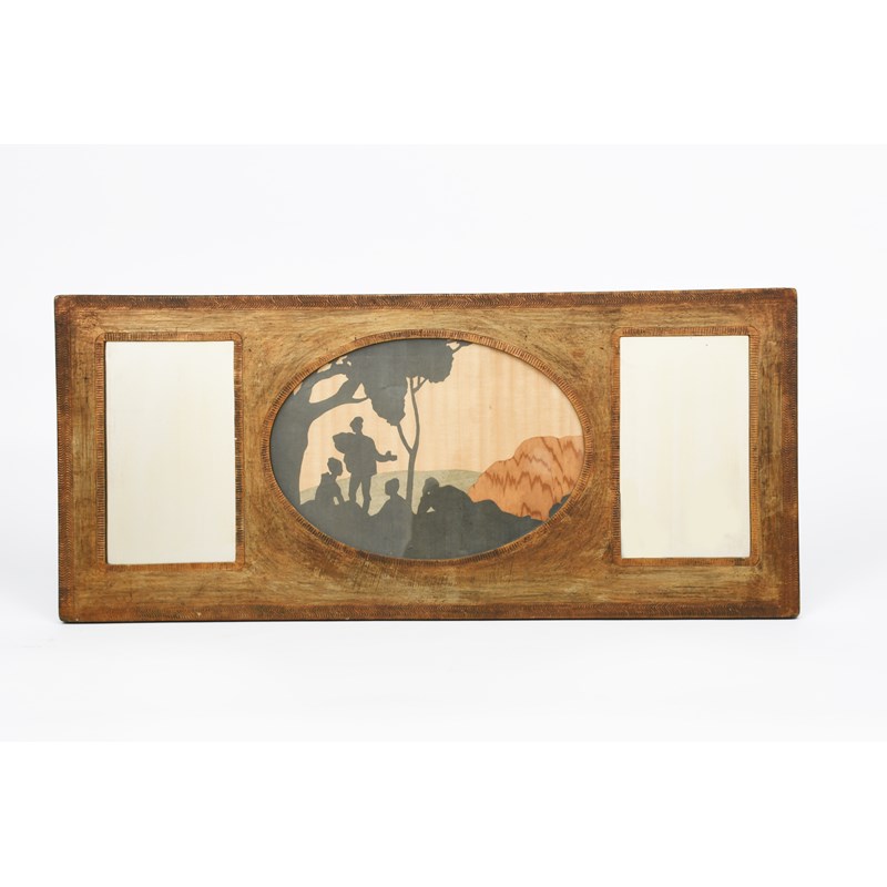 A Rowley Gallery marquetry wall mirror, rectangular, two mirror panels flanking central oval marquetry panels of figures in a landscape, and another wall mirror smaller, applied paper label, 80.5 x 35,5cm.(2)