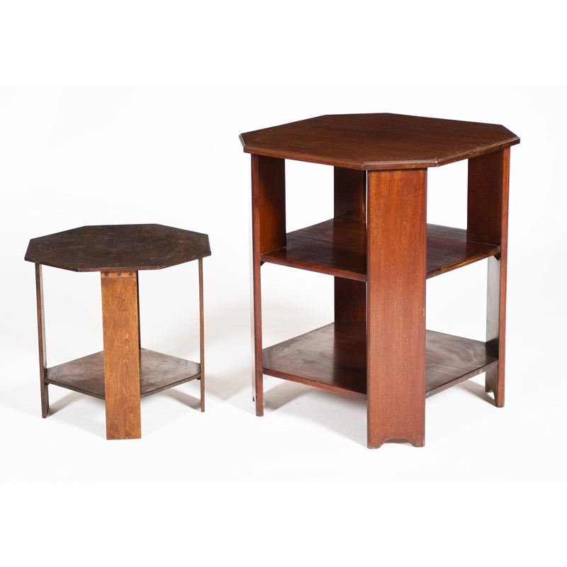 A small ebonised wood stool possibly retailed by Liberty & Co, turned legs with strung seat, and two mahogany occasional tables, unsigned, 32cm wide, 39cm high, (3)