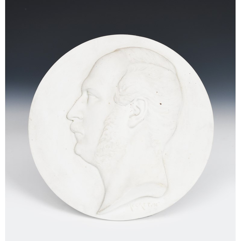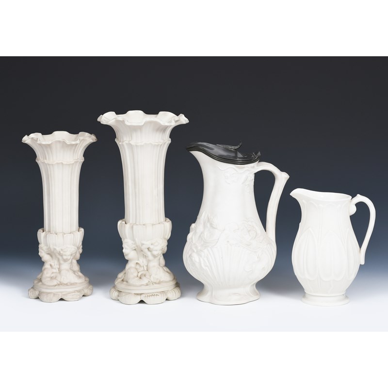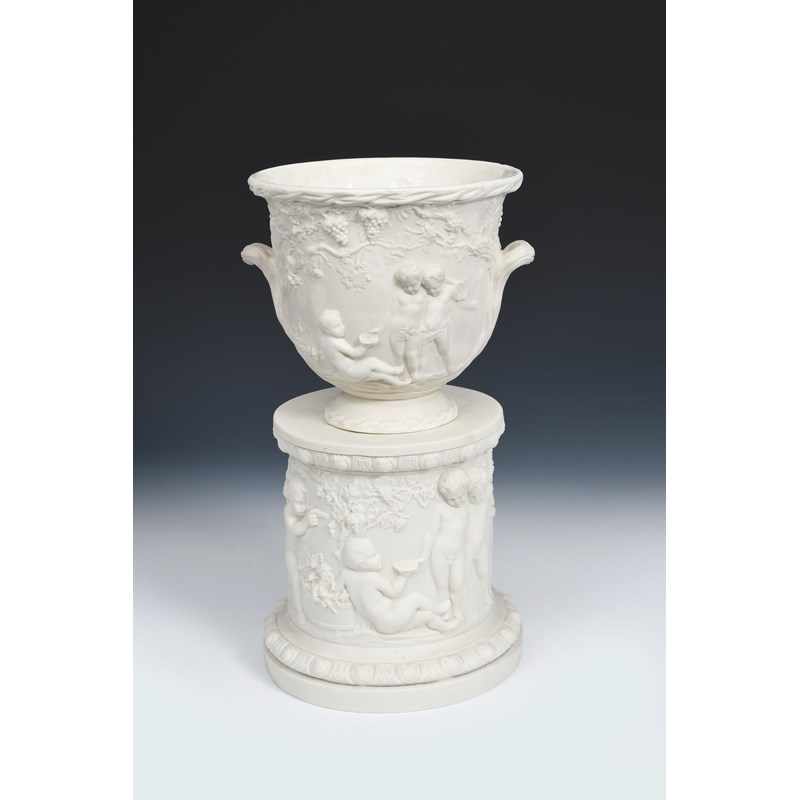 A Copeland Parian Ware jardiniere and stand, cast in low relief with Bacchanalian children collecting grapes from a grape vine, two graduated Parian Ware trumpet vases cast with sea nymphs, a Parian Ware plaque of Prince Albert from a plaque by Megret, another plaque and two Parian Ware jugs, stamped Copeland 40.5cm. high (8)