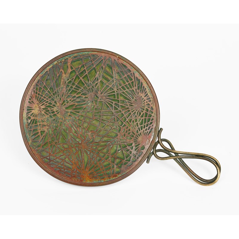 A Tiffany Studios bronze hand mirror, model no.895, the pierced circular body decorated with abstract pine needle design over verdi gris bronze plate, with wirework handle, stamped Tiffany Studios New York 895, 29.5cm. long.