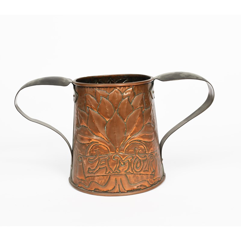 A repousse copper twin-handled vase probably Yattendon and designed by Mrs Alfred Waterhouse, tapering cylindrical form with applied strap handles, hammered in low relief with a stylised flower, inscribed Amor, to both sides, unsigned, 21cm. high