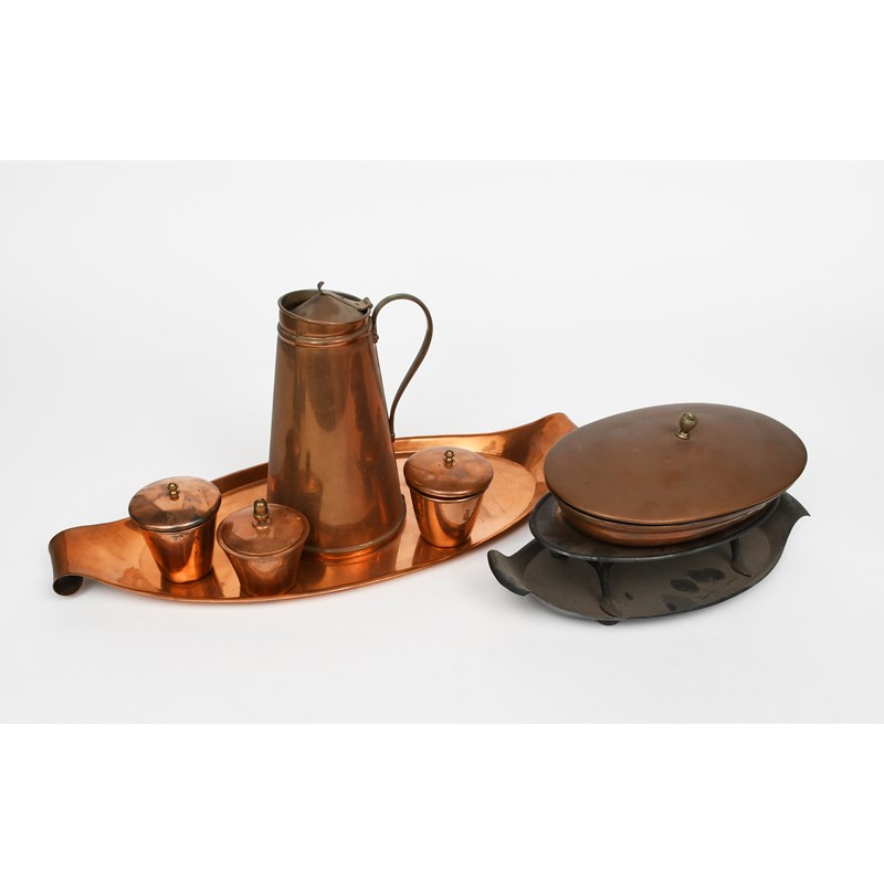 A W A S Benson copper and brass tureen and cover on stand, elliptical with slightly domed cover on twin-handled tray, on ebonised wood feet, a WAS Benson vacuum flask, a WAS Benson copper pot and cover and two similar, and a KSIA muffin dish and cover, stamped marks, 30cm. wide (12)