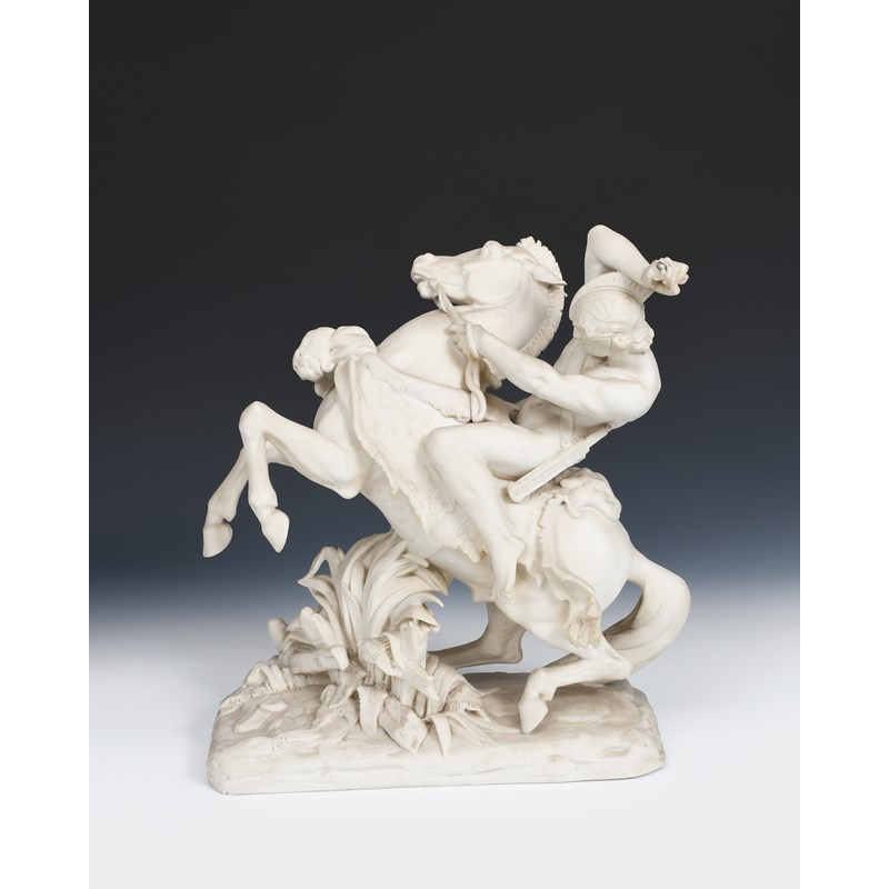 'Theseus' a Minton Parian Ware figure probably modelled by A Carrier-Belleuse, modelled riding a rearing horse, incised Ermine mark, stress hairlines to base, 41.5cm. high