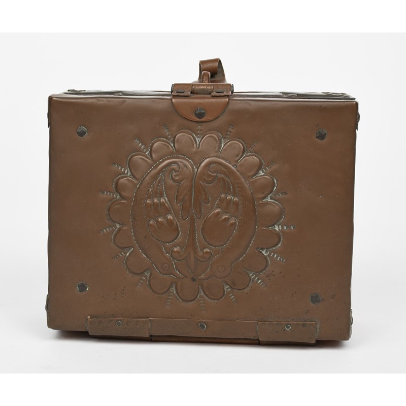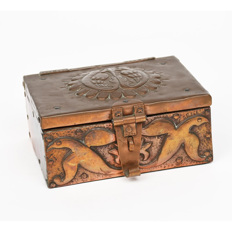 A John Pearson repousse copper casket, dated 1900, rectangular form, with hinged cover, the cover hammered in relief with two stylised birds forming a roundel, the front panel of the box hammered in relief with two stylised flying birds, punched JP monogram and 1900, 17 x 13cm.