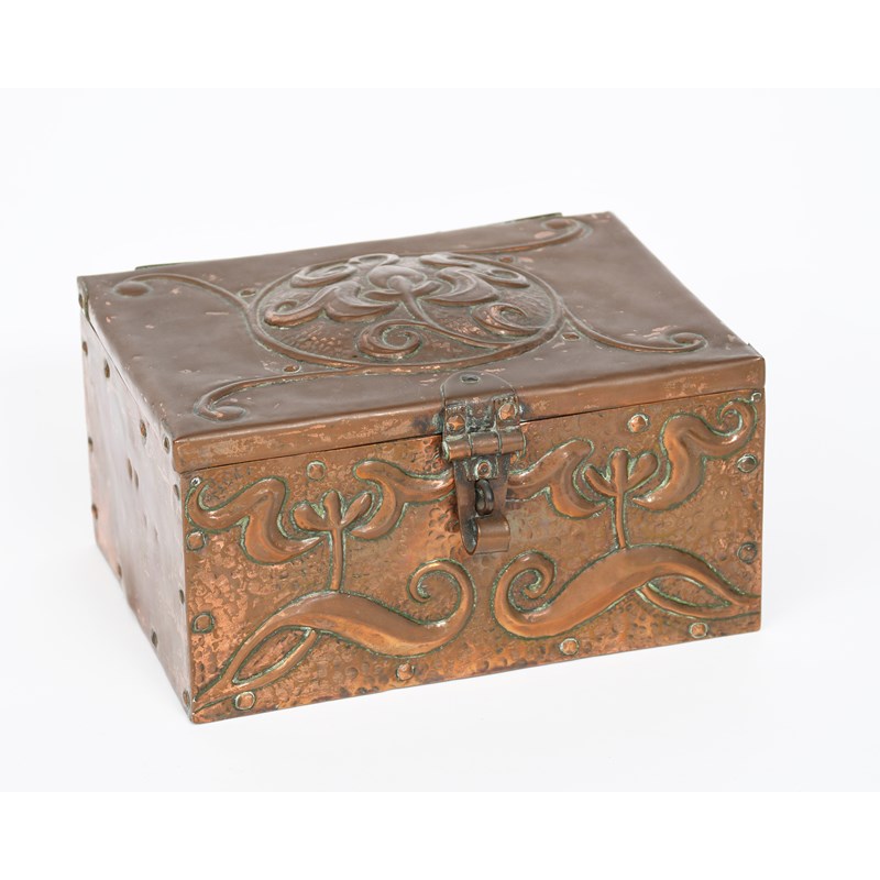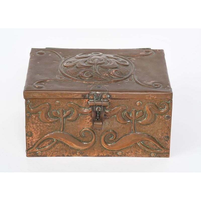 A John Pearson repousse copper casket, dated 1899, cedar lined rectangular form with hinged cover, hammered in relief with a foliate roundel to the cover, the front of the box with stylised flower stems, stamped JP 1899 to back, 15cm. deep, 20.5cm. high