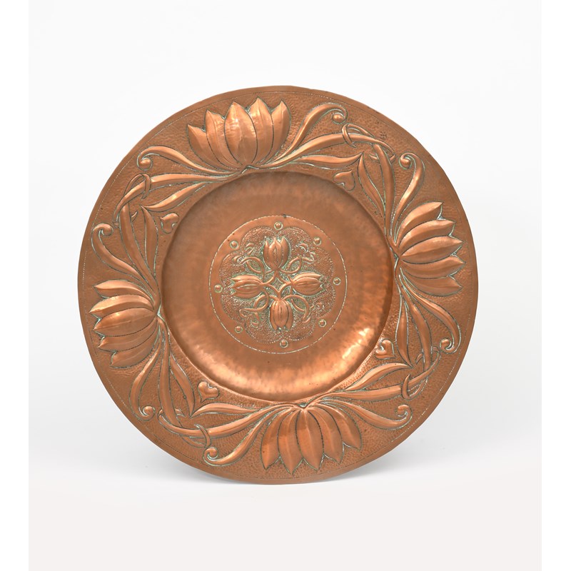 A repousse copper charger in the manner of John Pearson, possibly Guild of Handicrafts, hammered to the rim with a frieze of waterlily flowers and scrolling foliage, the well a roundel of similar flower buds and foliage, unsigned, 41cm. diam.