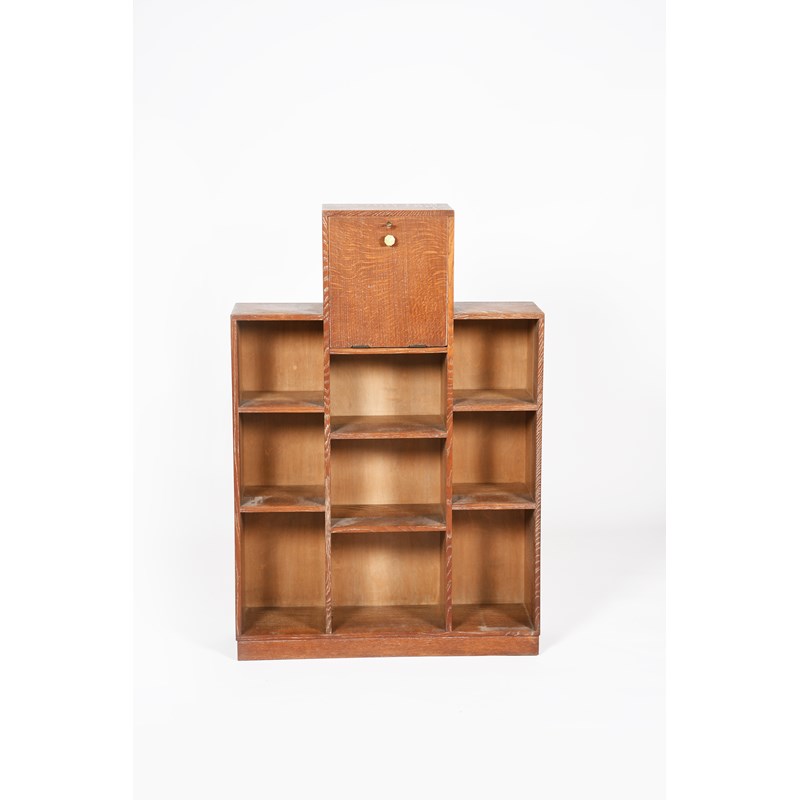An Art Deco limed oak bookcase, three stepped banks of shelves with a hinged, drop down compartment, with green bakelite handle, unsigned, 109cm. high, 73cm. wide
