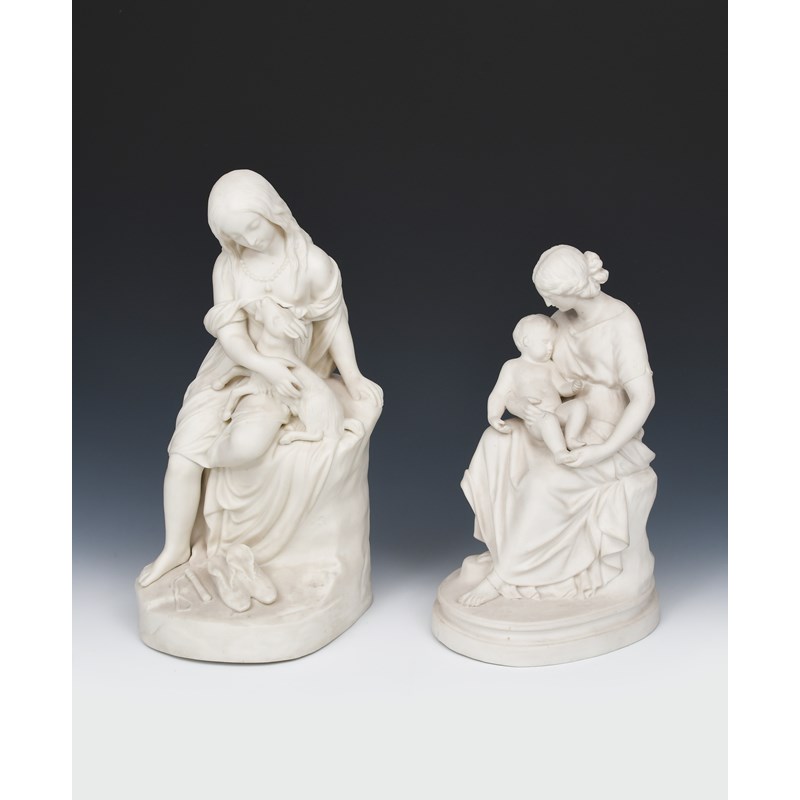 'Maria' a Turner & Co Art Union of Great Britain Parian Ware figure, modelled as a woman resting with a goat, and another Parian Ware figure group model 156, impressed marks, damages, 35cm. high, (2)