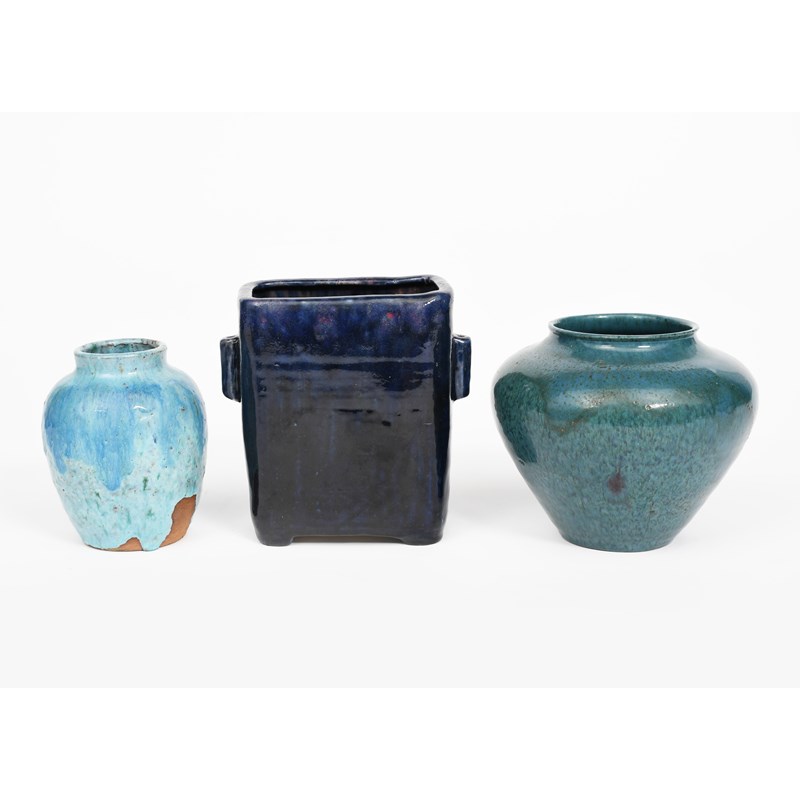 a Coldrum Pottery vase, rectangular section with applied cylinder lug handles, covered in a running mottled blue glaze, and two other pottery vases by Reginald Wells covered in mottled blue glazes one Coldrum Pottery the other Soon, impressed Coldrum Chelsea (main vase), 15.5cm. high, (3)