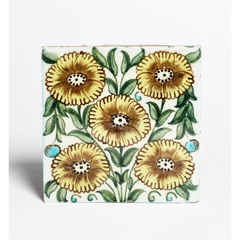 A William De Morgan Merton Abbey tile, painted with five flowers in yellow, brown, blue and green on a white ground, impressed factory marks, 15.5cm. square