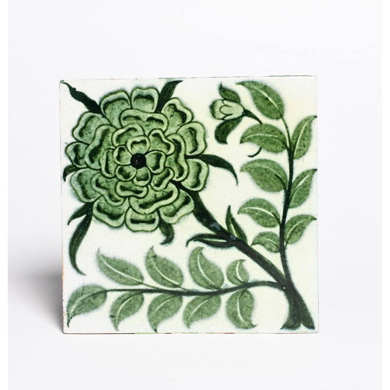 A William De Morgan Sand's End Pottery Four Inch Rose (variant) tile, painted with a rose in green on a white ground, impressed factory marks, 15.3cm. square
