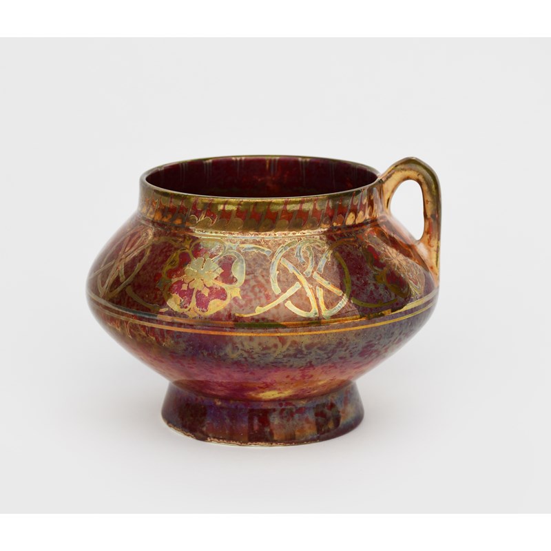 A Pilkington's Lancastrian vase by Gladys Rogers, shape no.2974, shouldered form with loop handle, painted with a band of rose flowers on a scrolling, entwined stem, in golden lustre on mottled red and yellow lustre ground, streaked red interior, impressed marks, painted artist cipher, 11cm. high